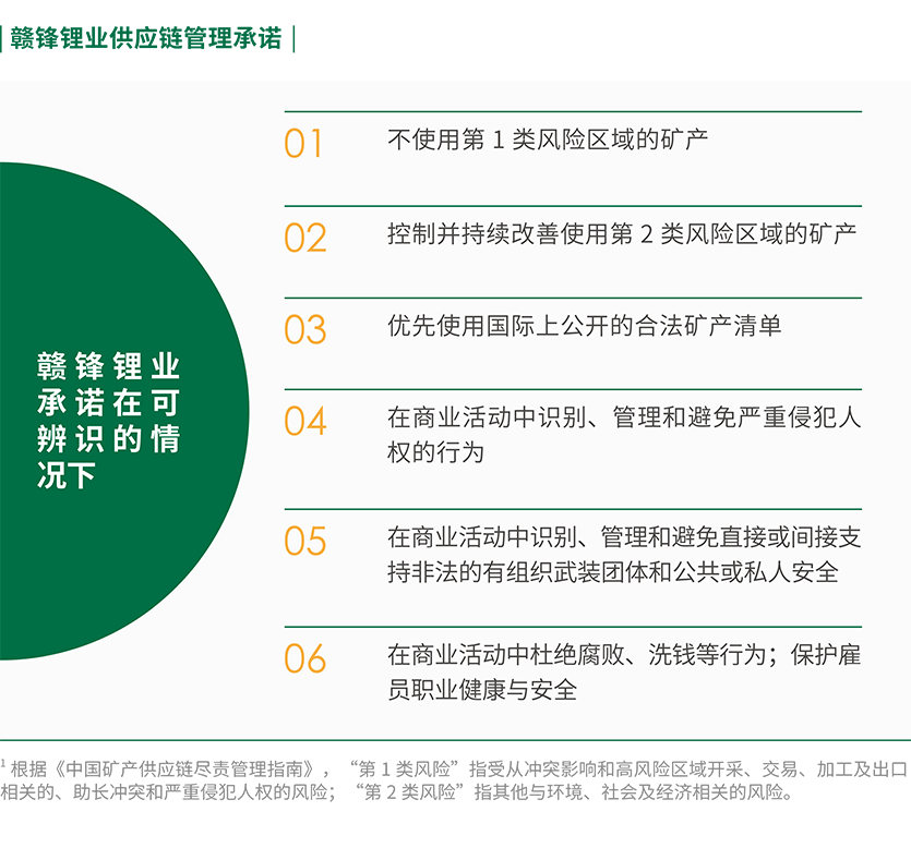 對于生產(chǎn)過程中可能涉及的鋰金屬礦產(chǎn)資源使用情況,公司堅(jiān)持道德采購,承諾不使用來自沖突地區(qū)的礦產(chǎn)資源,也明確要求供應(yīng)商不得使用來自沖突地區(qū)及違反公司政策的礦產(chǎn)資源。為處理負(fù)責(zé)任礦產(chǎn)供應(yīng)鏈的風(fēng)險(xiǎn)與隱患,公司常態(tài)化沖突礦產(chǎn)專項(xiàng)管理,并根據(jù)海內(nèi)外業(yè)務(wù)動態(tài)不斷進(jìn)行完善。公司經(jīng)營人員在澳大利亞、阿根廷、墨西哥、愛爾蘭等地投資參股鋰礦權(quán)項(xiàng)目并擔(dān)任董事,與其簽訂包銷協(xié)議,通過股權(quán)與包銷協(xié)議的方式,確保礦原材料的來源、運(yùn)輸路徑明確,達(dá)到風(fēng)險(xiǎn)可控、可追溯的目的。